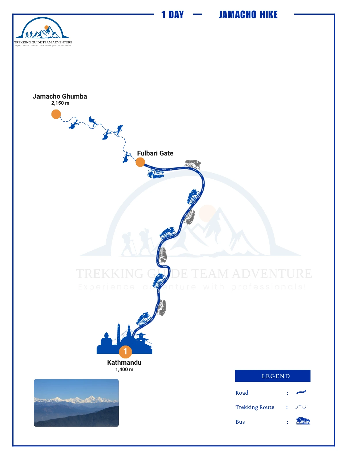One day hike to Jamacho comprises of a tour guide and a private vehicle/transportation. The package excludes food, drinks or souvenir expenses. It is advisable to have a budget of at least USD$10 to USD$20 for snacks water during the hike. Not to forget do have some Nepalese cash exchanged for your convenience and smooth hike.
